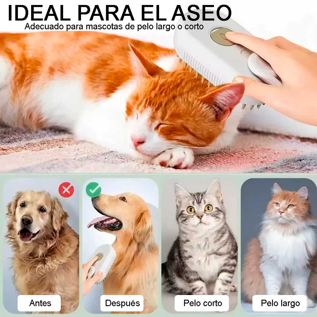 - Limpieza profunda sin esfuerzo: elimina polvo y pelo muerto con una suave niebla de vapor, sin ataques al pelaje.